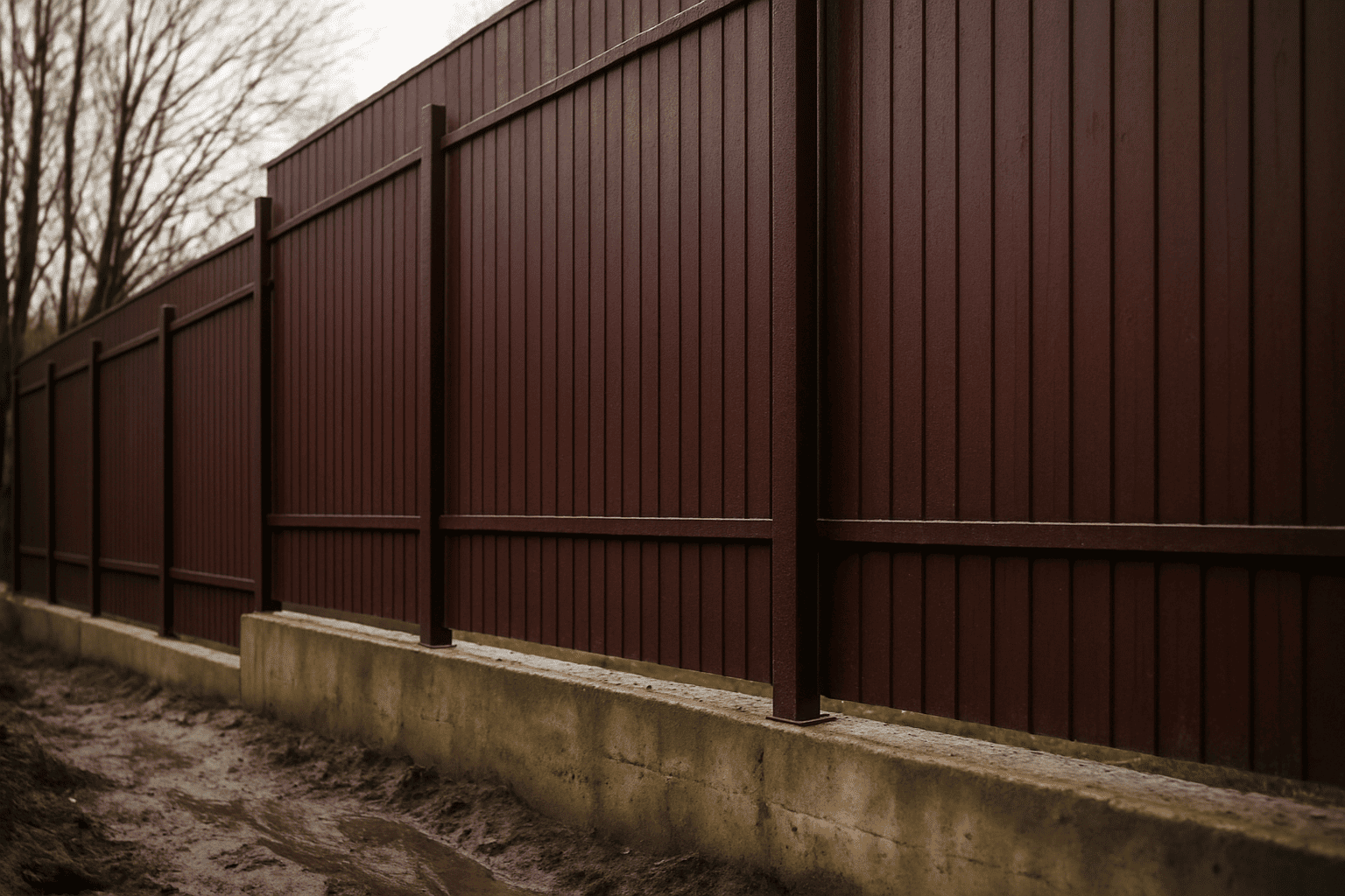 Для установки забора из профнастила под ключ применяются металлические столбы, которые бетонируются в грунт на глубину 0,8–1,2 м. Правильная установка и выравнивание по уровню — залог прочности всей конструкции. -